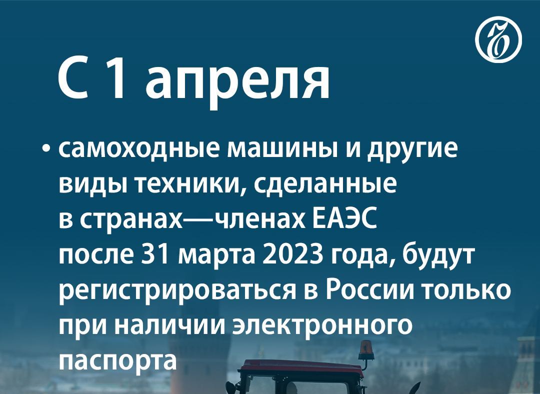 - С 1 апреля самоходные машины и другие виды техники, сделанные в странах-членах ЕАЭС после 31 марта 2023 года, будут регистрировать в России только при наличии электронного паспорта.