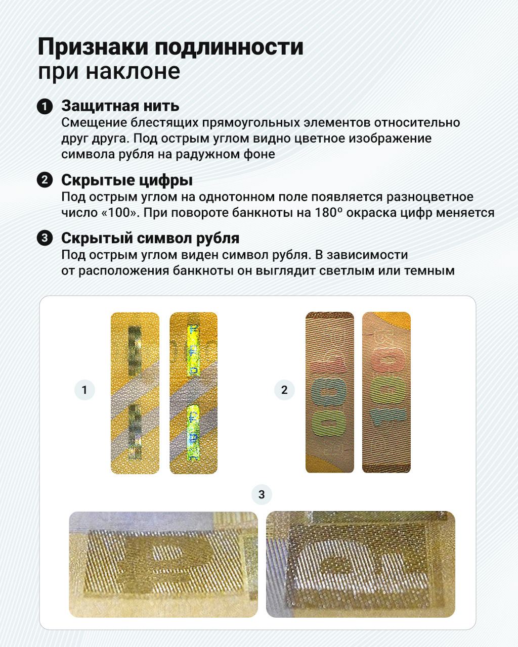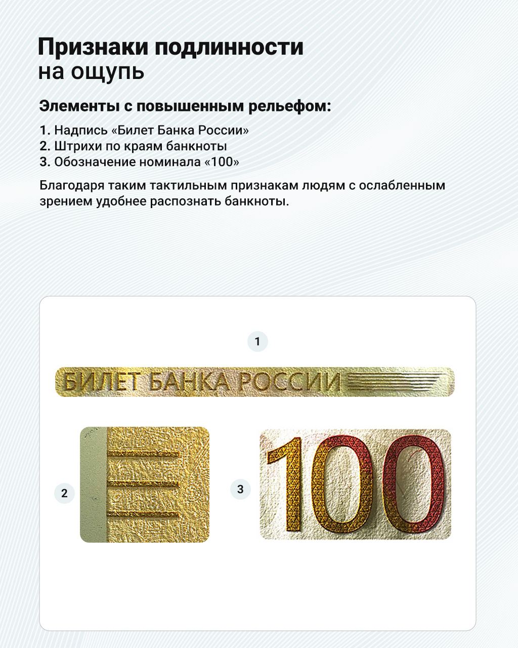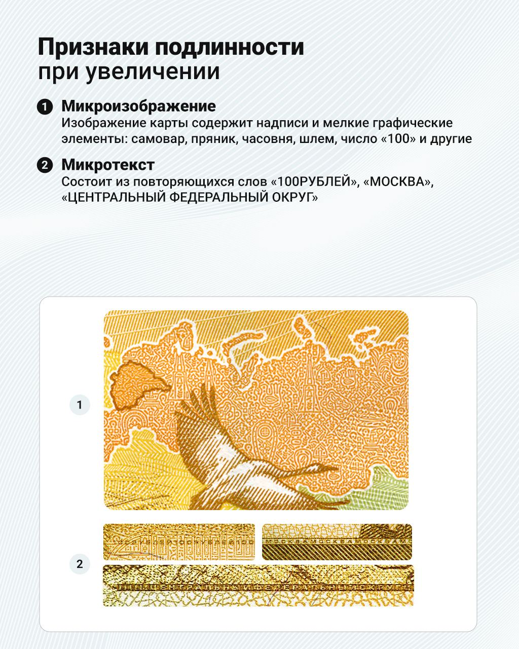 Напомним, что Центробанк представил новую банкноту номиналом 100 рублей в 2022 году. Такие банкноты постепенно появляются в обращении в разных регионах, заменяя собой ветхие деньги. Инфографика рассказывает о дизайне модернизированных денег и их защитных признаках.