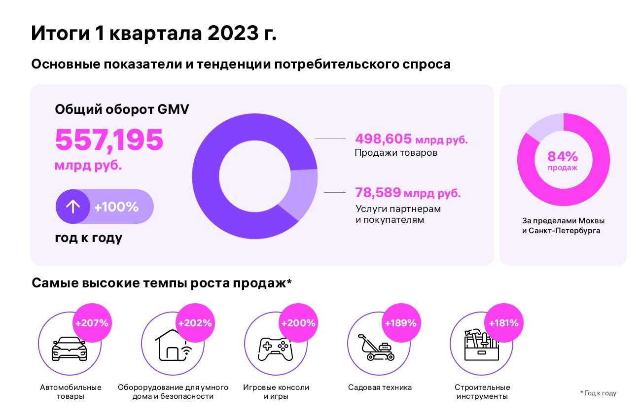 Продажи товаров, включая возвраты, скидки и НДС, составили более 498,6 млрд ₽, рост +95 % год к году. Услуги партнёрам и покупателям — почти 78,6 млрд ₽, +135 %.