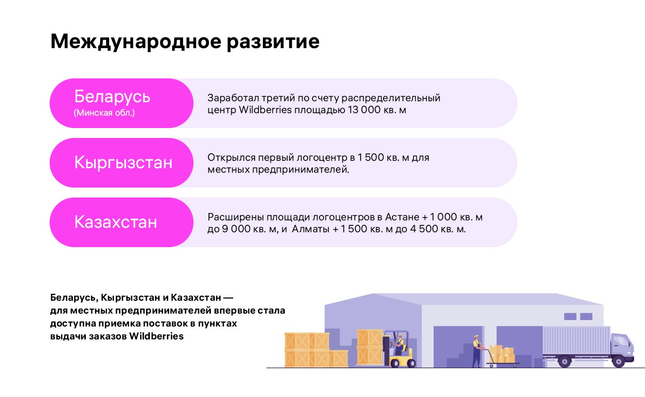 Так, под Минском заработал третий по счёту распределительный центр Wildberries площадью 13 тыс. кв. м. В Кыргызстане первый логоцентр в 1500 кв. м открылся для местных предпринимателей. В Астане на 1000 кв. м, до 9000 кв. м, расширили площадь логоцентра, а сортировочного центра в Алматы — на 1500 кв. м, до 4500 кв. м.