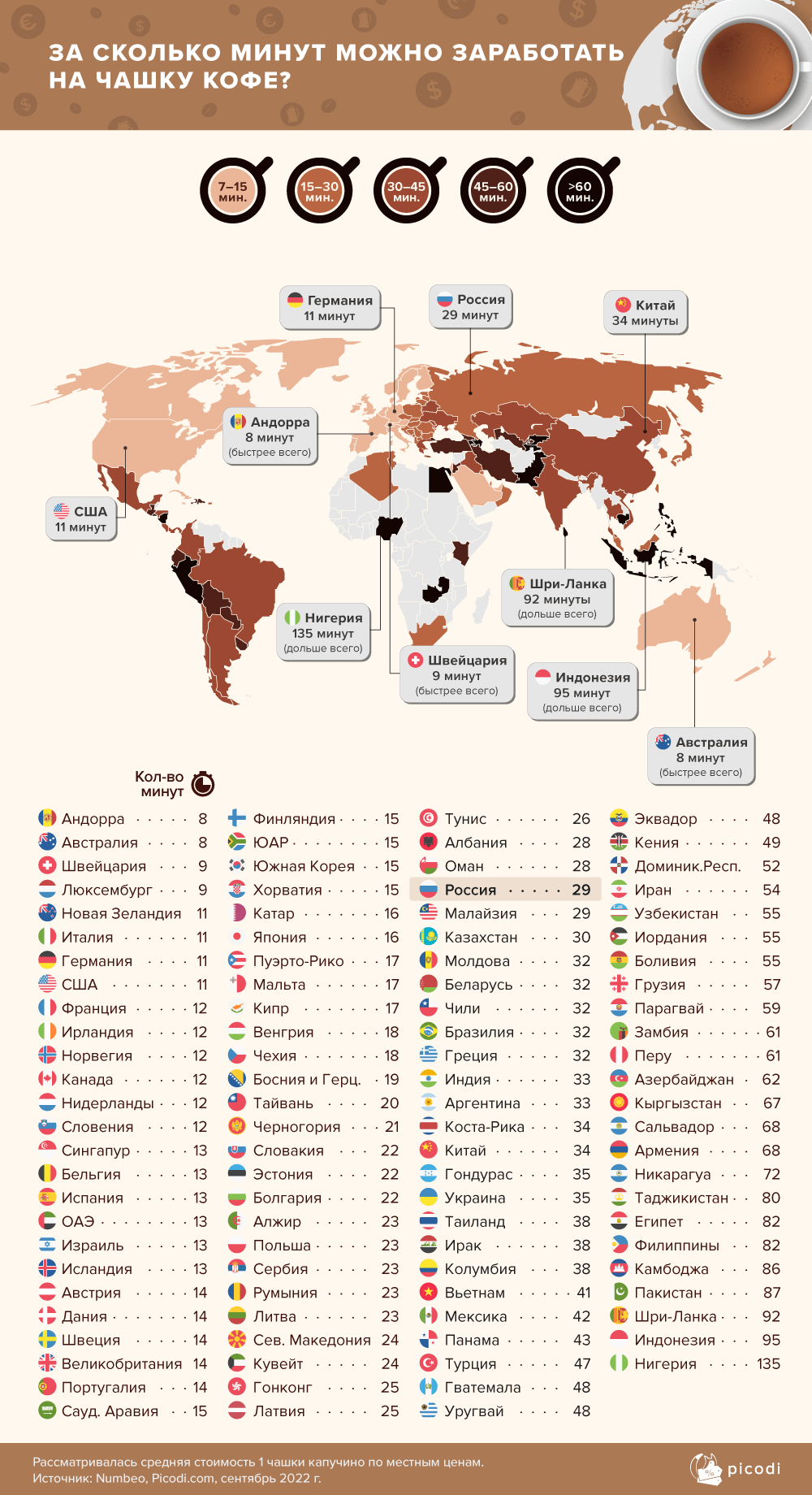 Последние места рейтинга достаются Шри-Ланке, Индонезии и Нигерии. В Нигерии на капучино нужно работать более двух часов, в Индонезии — 1 час и 35 минут, а на Шри-Ланке — чуть более 1,5 часов.