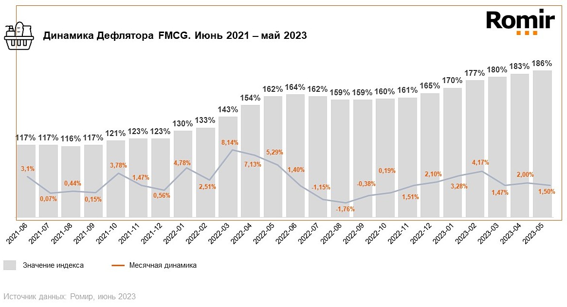 Исследовательский холдинг «Ромир» продолжает проводить расчёты статистического индекса-дефлятора, отражающего фактические изменения общего уровня цен на товары в категории первой необходимости (FMCG).