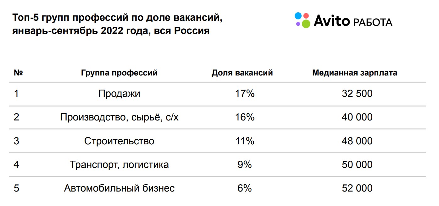 Второй год подряд по доле вакансий стабильно лидируют продажи» с 17 %, производство, сырьё, сельское хозяйство с 16 %, строительство с 11 %.