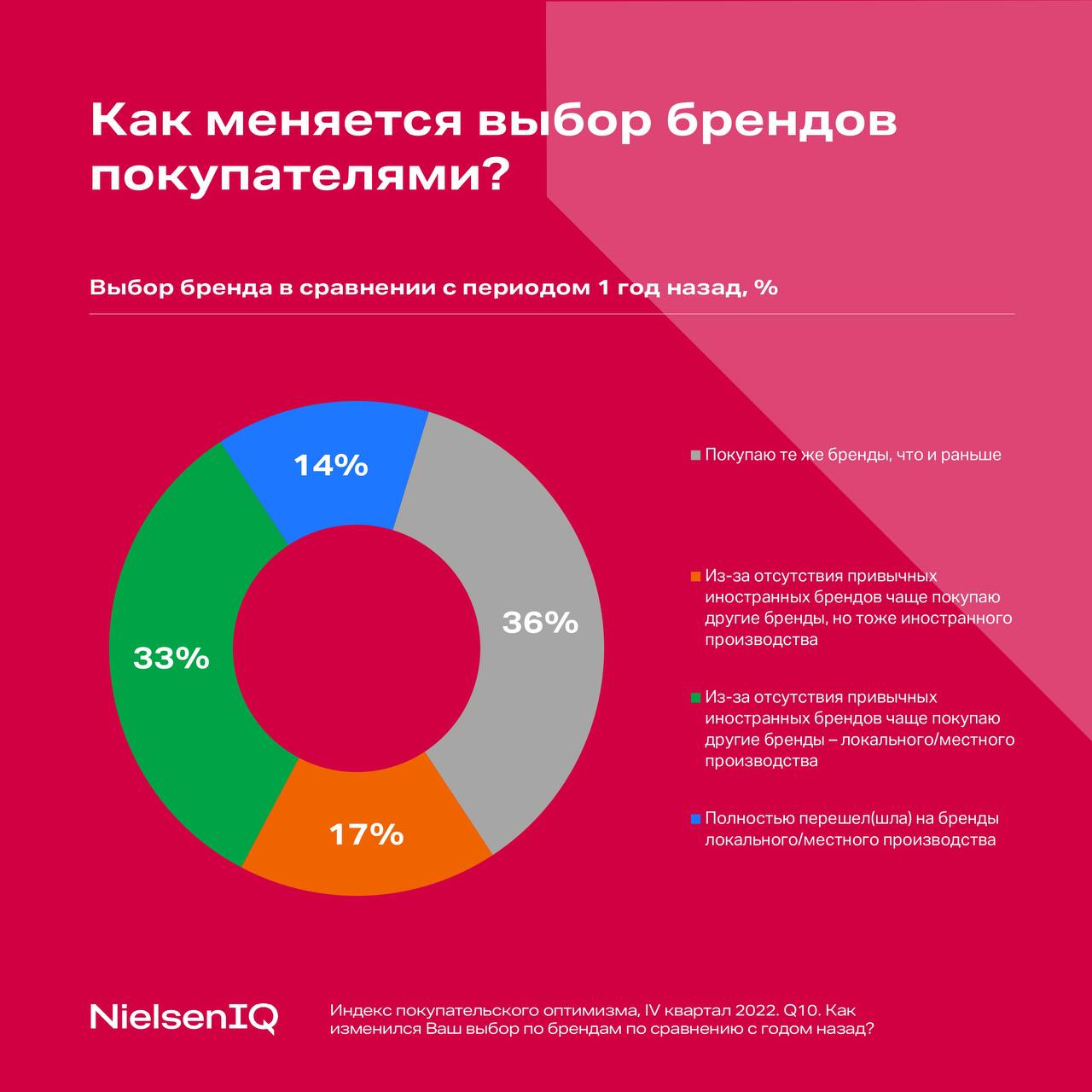 Исследовательская компания NielsenIQ, опрашивая 1000 жителей российских городов-миллионников, рассчитывает ежеквартальный индекс потребительского оптимизма. По итогам четвёртого квартала 2022 года аналитики добавили тему локальных брендов.