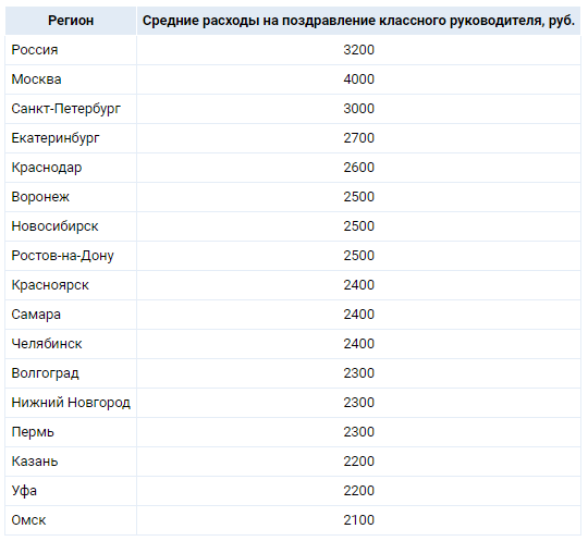 По данным портала SuperJob, опросившего порядка 3 тыс. родителей школьников из разных регионов России, средние расходы на подарок классному руководителю в честь Дня учителя за два года выросли на 20 %. Это 3200 рублей вместо 2650-ти в 2019-м.
