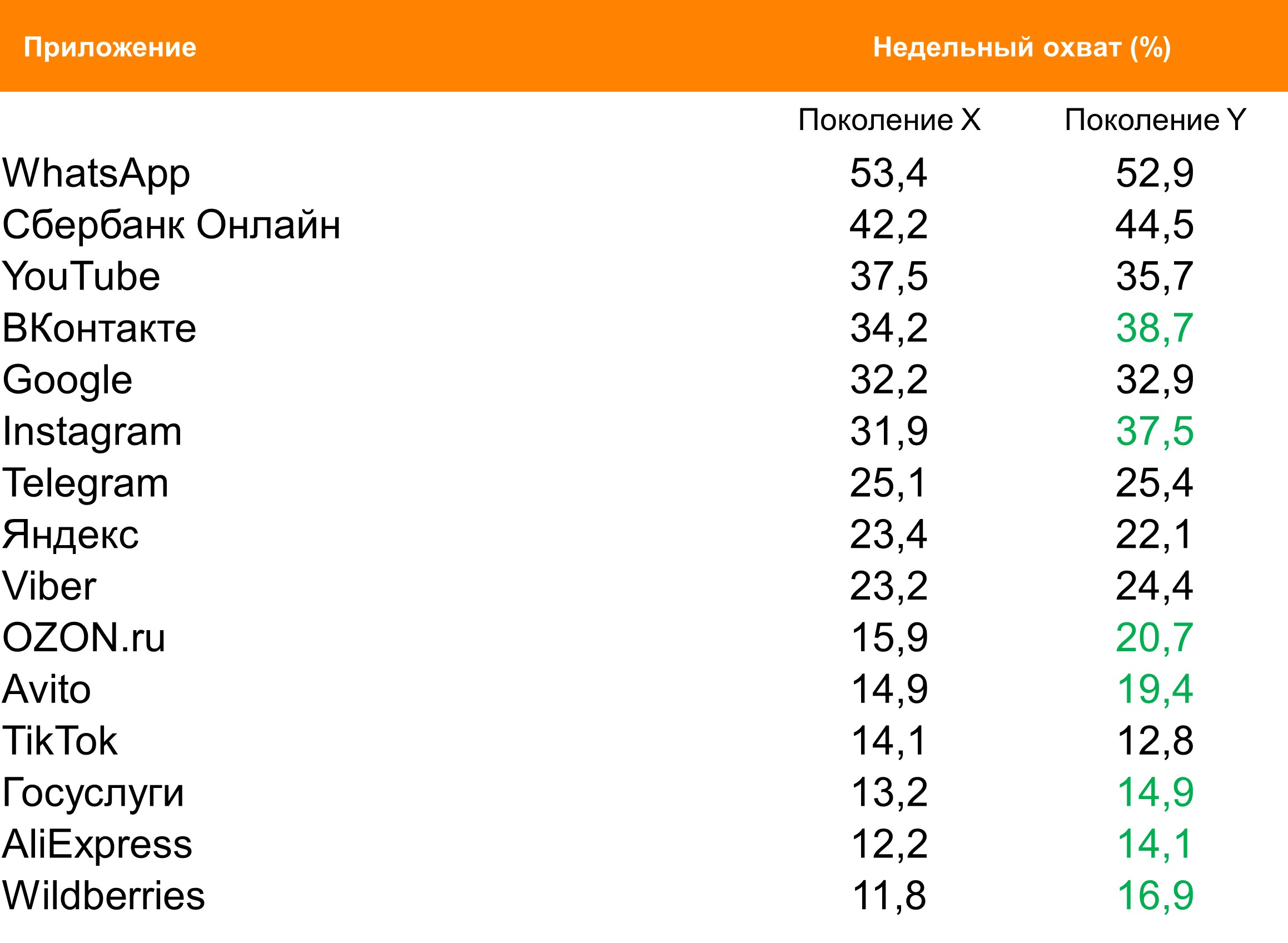 Итак, вполне предсказуемо миллениалы чаще «людей X» сидели в Интернете. И гораздо больше использовали приложения соцсетей «ВКонтакте» и Instagram, маркетплейсов Ozon, Wildberries и AliExpress, а также ресурса «Госуслуг».
