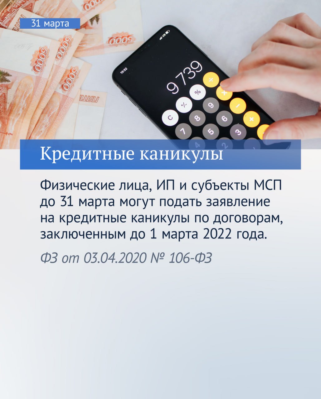 Так, физические лица, ИП и субъекты МСП до 31 марта могут подать заявление на кредитные каникулы по договорам, заключённым до 1 марта 2022 года. Основание для этого — федеральный закон от 03.04.2020 № 106-ФЗ.
