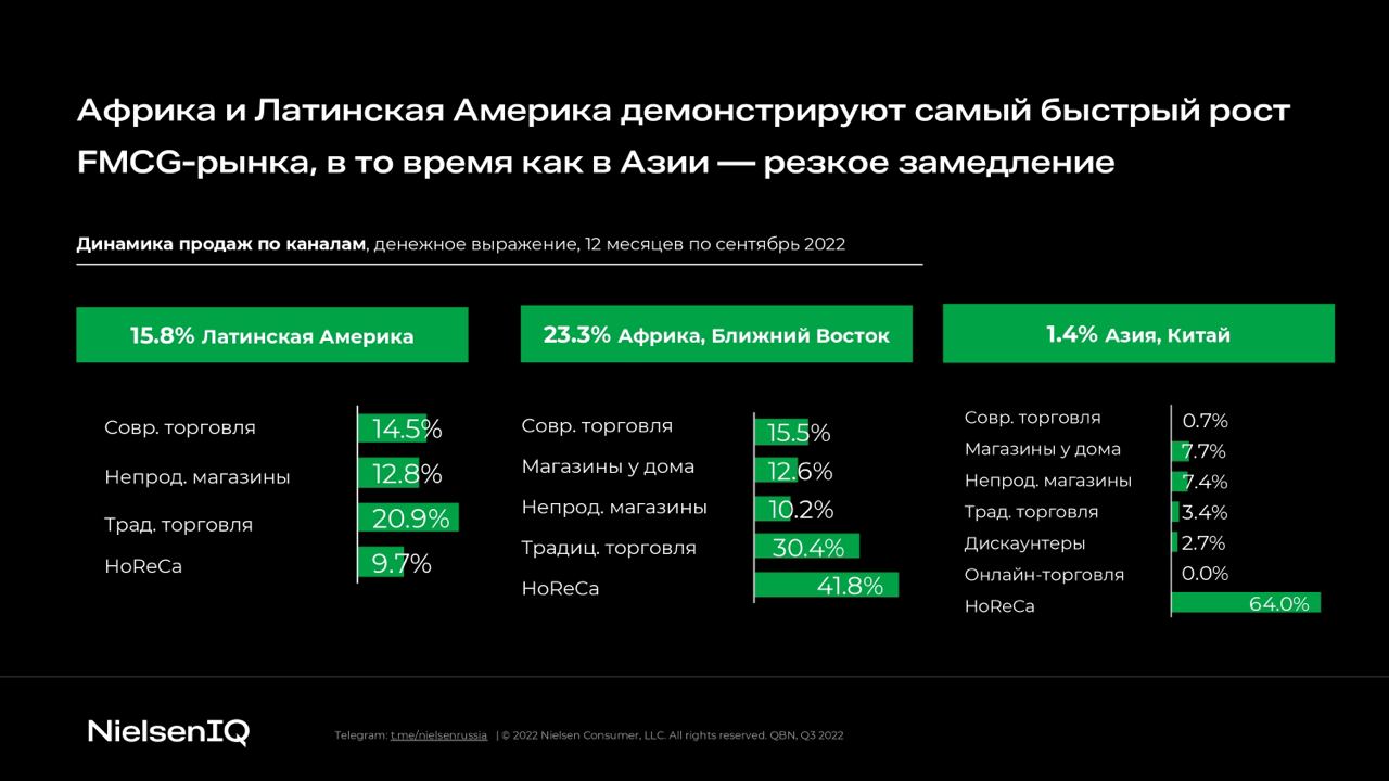 - В III квартале самая высокая динамика рынка FMCG по-прежнему наблюдается в Африке и на Ближнем Востоке, а также в Латинской Америке.