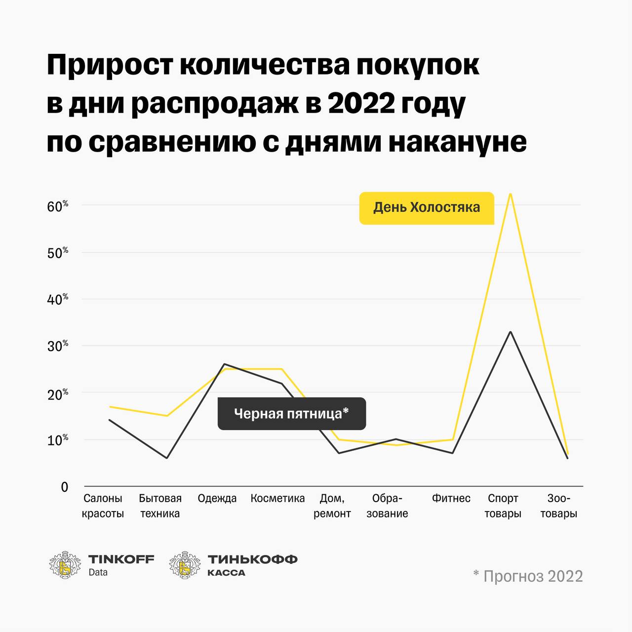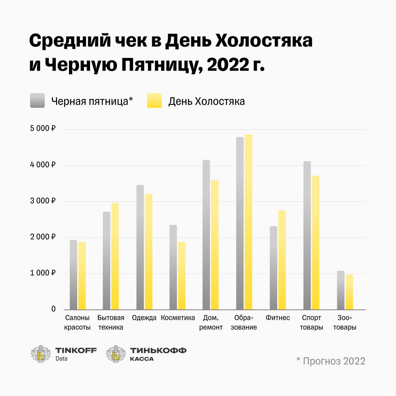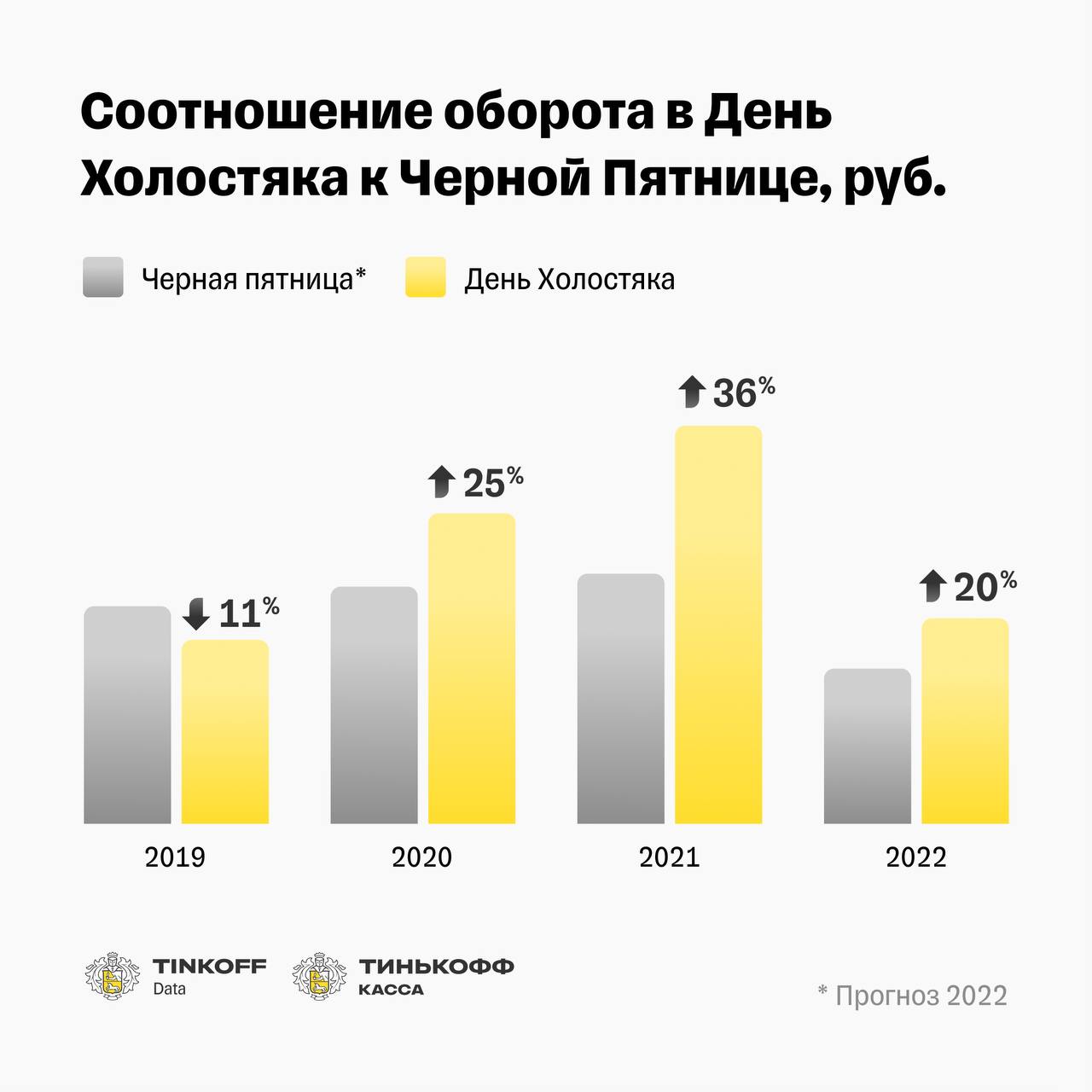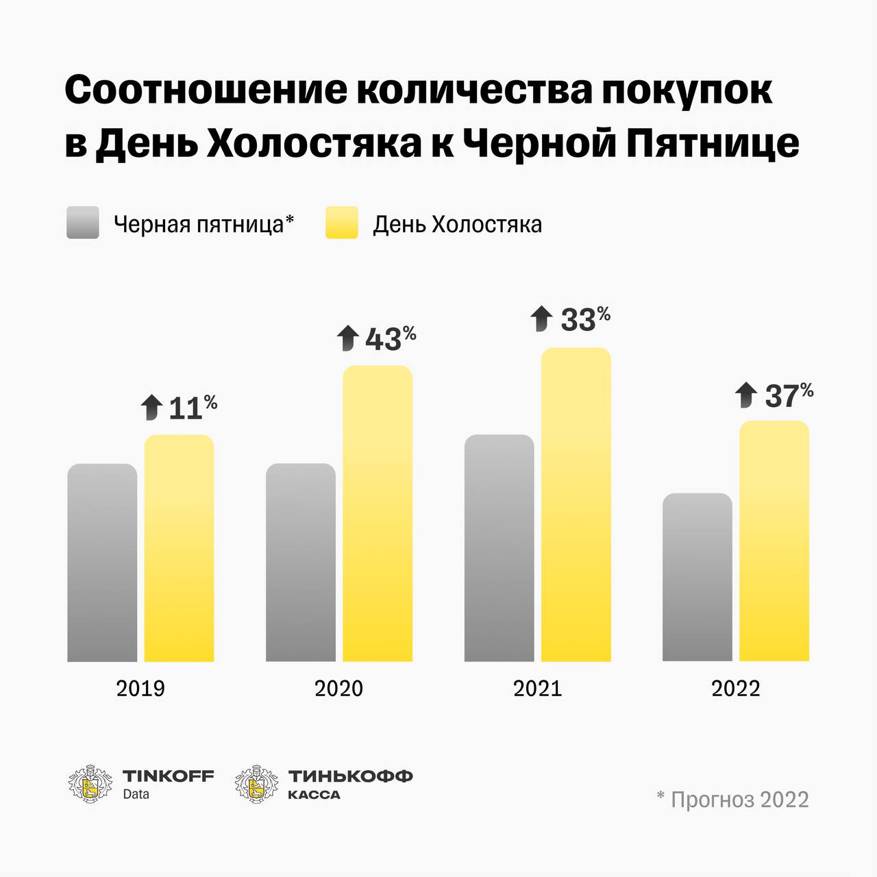 - В День холостяка в 2022 году, он же распродажа 11.11, россияне потратили на 20 % больше средств и сделали на 37 % больше покупок, чем сделают в эту «Чёрную пятницу».