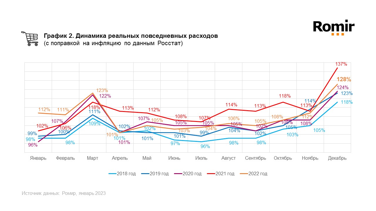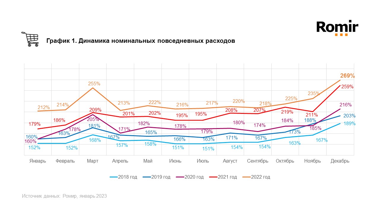 Согласно результатам исследования на базе Единой панели данных «Ромир», в декабре 2022 года индекс повседневных номинальных, без поправки на инфляцию, расходов россиян составил 269 %, что на 34 процентных пункта (14,5 %) больше, чем в ноябре. В годовой динамике индекс увеличился на 10 п. п. (3,9 %).
