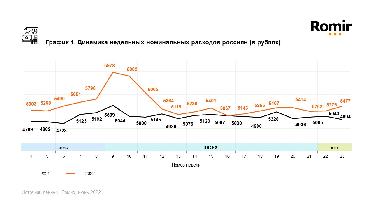 С 6 по 12 июня средние недельные расходы россиян увеличились по сравнению с предшествующей неделей на 3,8 %. ИНР составил 5 477 рублей. В годовой динамике расходы выросли на 11,9 %.