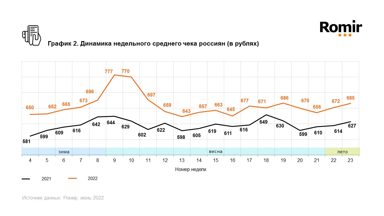 Исследовательский холдинг «Ромир» представил данные по индексу недельных расходов (ИНР) и индексу недельного среднего чека (ИНСЧ).