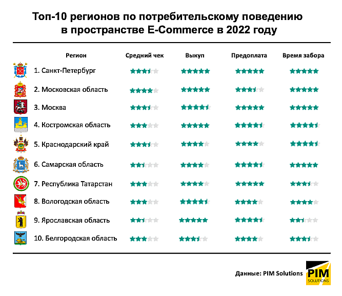 Компания PIM Solutions выпустила рейтинг российских регионов по потребительскому поведению их жителей в интернете в 2022 году. Исследование базируется на 26,4 млн интернет-заказов, прошедших через сервисы PIM Solutions с 24 февраля по 24 августа 2022 года. Количество интернет-магазинов, в которых были оформлены анализируемые заказы, превышает 68 тыс.