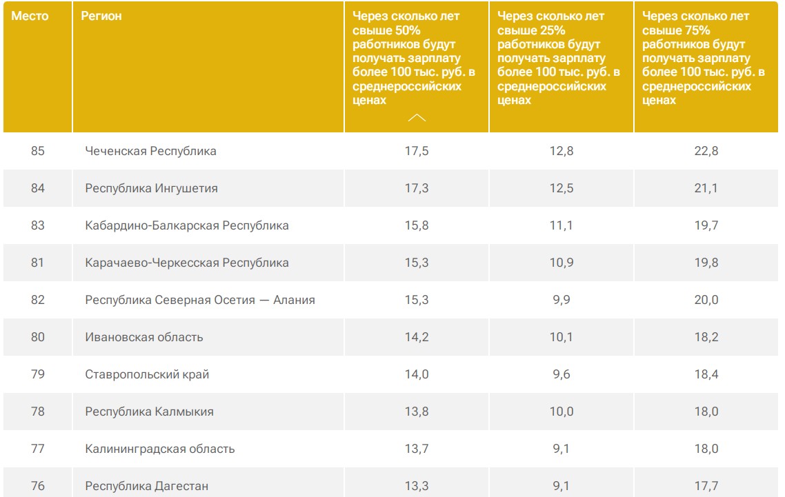 На последних строчках — Кабардино-Балкария, Ингушетия и Чечня. Жители этих республик смогут приблизиться к такому уровню заработков минимум через 15 лет.