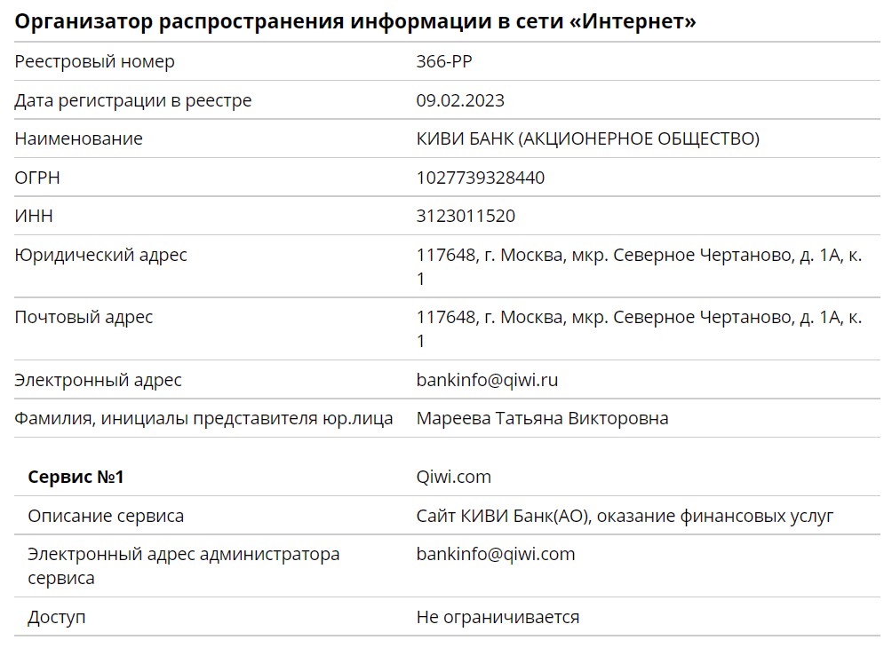 Роскомнадзор внёс сайт электронной платежной системы Qiwi в реестр организаторов распространения информации. Сайт электронной платежной системы Qiwi (qiwi.com) с 9 февраля 2023 года внесли в реестр организаторов распространения информации, следует из самого реестра. Это означает, что теперь Qiwi должна хранить сведения о всех действиях и взаимодействиях пользователей и передавать их силовикам по требованию.