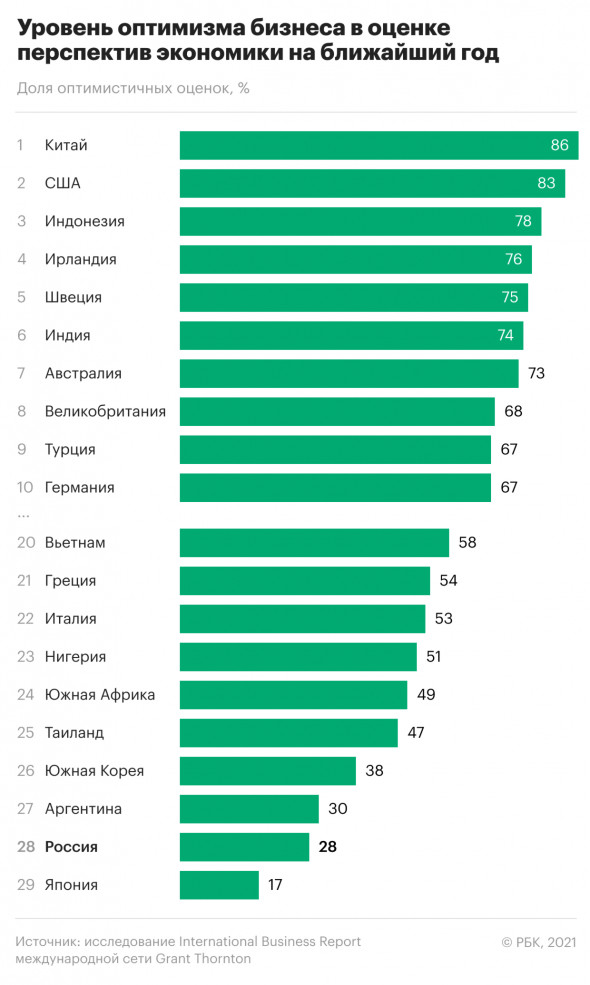 В России 28 % руководителей бизнеса, опрошенных в мае — июне 2021 года, оптимистично смотрят на перспективы отечественной экономики в ближайший год — по сравнению с 17 % год назад и 21 % полгода назад. Только в Японии уровень бизнес-оптимизма ещё ниже — 17 % (эта страна много лет является антилидером рейтинга).