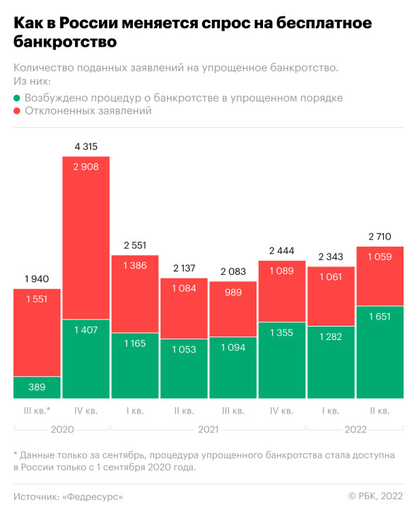 В апреле-июне российские многофункциональные центры (МФЦ) запустили процедуру бесплатного банкротства для 1 651 гражданина. Это рекорд за всё время существования подобной опции для россиян, следует из статистики «Федресурса» — Единого федерального реестра сведений о банкротстве.