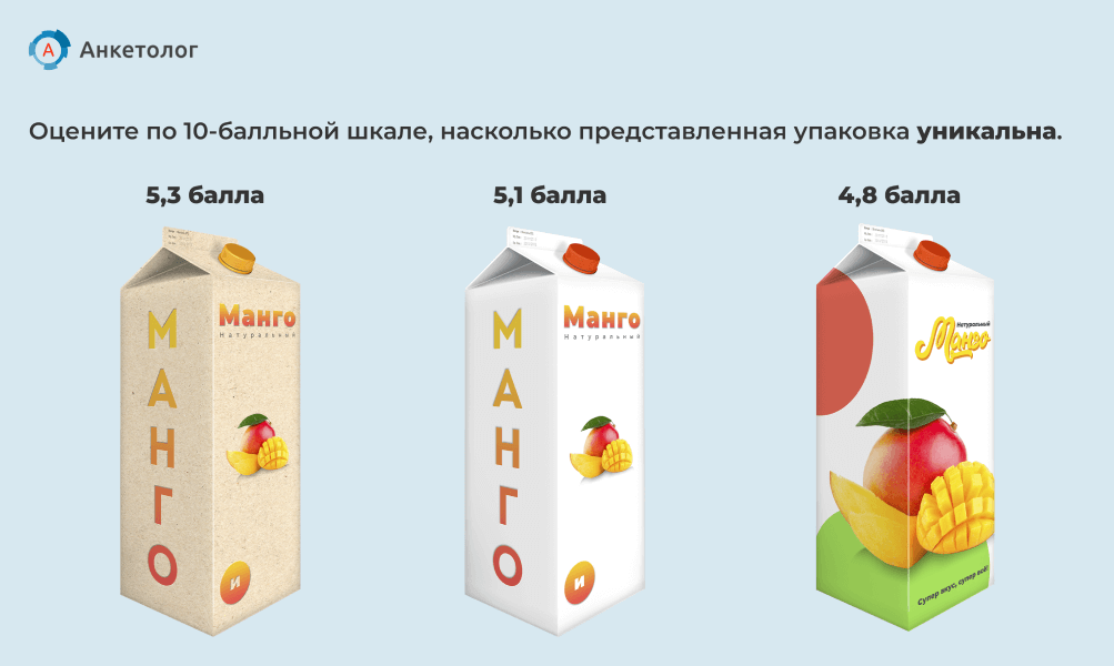 Однако когда респонденты оценивали уникальность упаковки, на первом месте оказался картонный тетрапак. На втором месте — белый, и только на третьем — яркий.