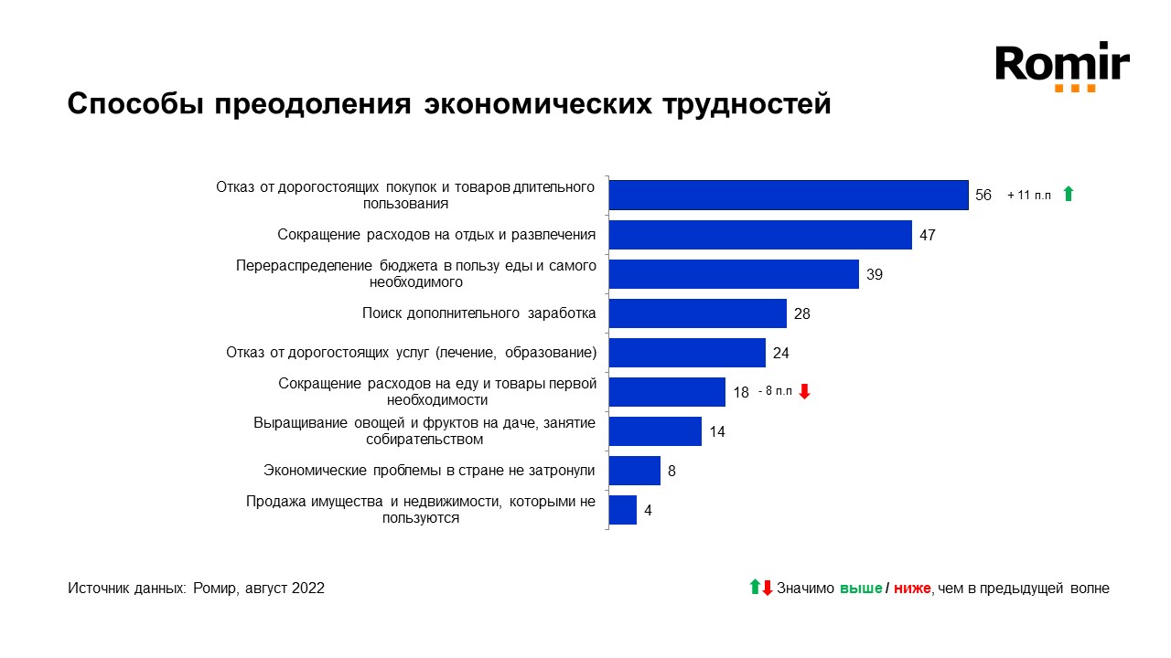 Самым популярным способом преодоления экономических трудностей с 22 по 28 августа стал отказ от дорогостоящих покупок и товаров длительного пользования. Со второго места на предшествующей неделе этот паттерн переместился на первое место. Доля экономящих на дорогостоящих покупках, увеличилась с 45 % до 56 %.
