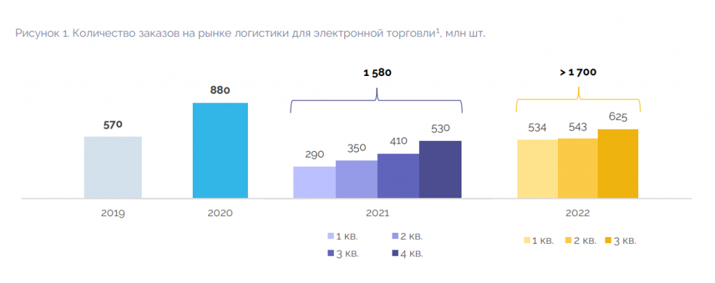За три квартала 2022 года на рынке электронной коммерции было доставлено 1 700 млн заказов. Это на 52 % больше, чем за такое же время год назад, следует из результатов исследования Data Insight «Последняя миля для интернет-торговли».