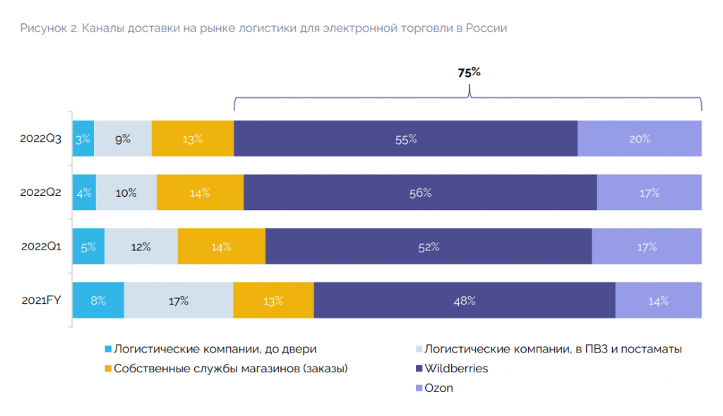 В среднем по итогам трёх кварталов 2022-го доля собственных служб доставки магазинов выросла на 11 п. п. — 86 % по сравнению с 75 % в 2021 году.