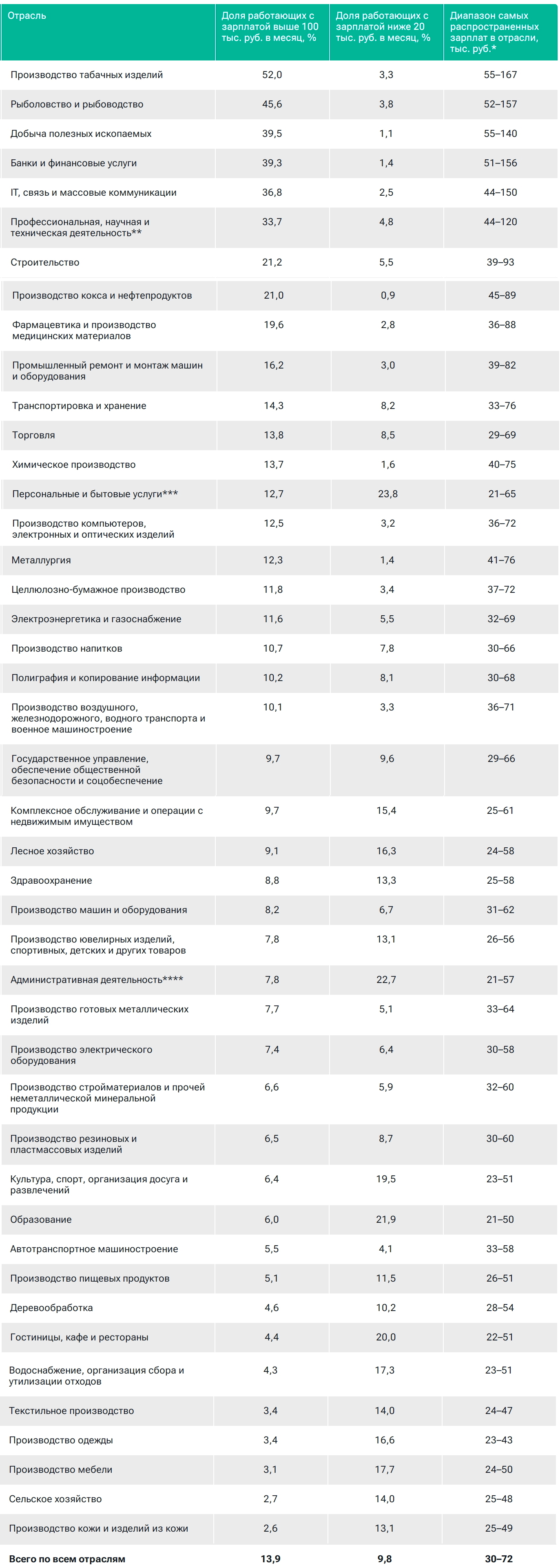 В рейтинге отраслей по заработным платам на первое место вышло производство табачных изделий — 52 % занятых получают более 100 тысяч рублей в месяц. На второй и третьей строчках — рыбное хозяйство и добыча полезных ископаемых соответственно.