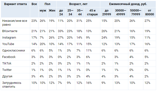 Предсказуемо поклонников «ВКонтакте», Instagram и TikTok больше среди молодежи до 24 лет, тогда как «Одноклассники» и Facebook выбирают граждане от 45 лет.