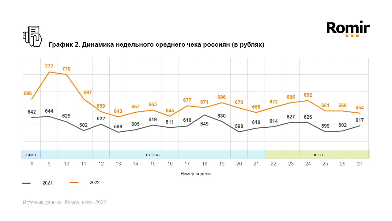 С 4 по 10 июля 2022-го средние недельные расходы россиян сократились по сравнению с предшествующей неделей на 0,7 %. Индекс недельных расходов составил 5 268 ₽. Годовой прирост сократился до 8,3 %. Неделей ранее он составлял 13,6 %.
