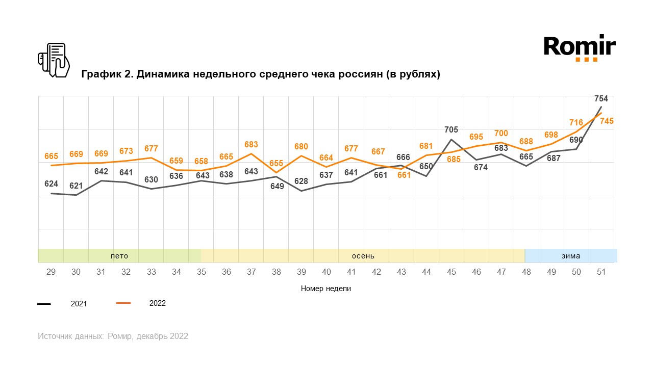 Исследовательский холдинг «Ромир» представил данные по индексу недельных расходов (ИНР) и индексу недельного среднего чека (ИНСЧ).