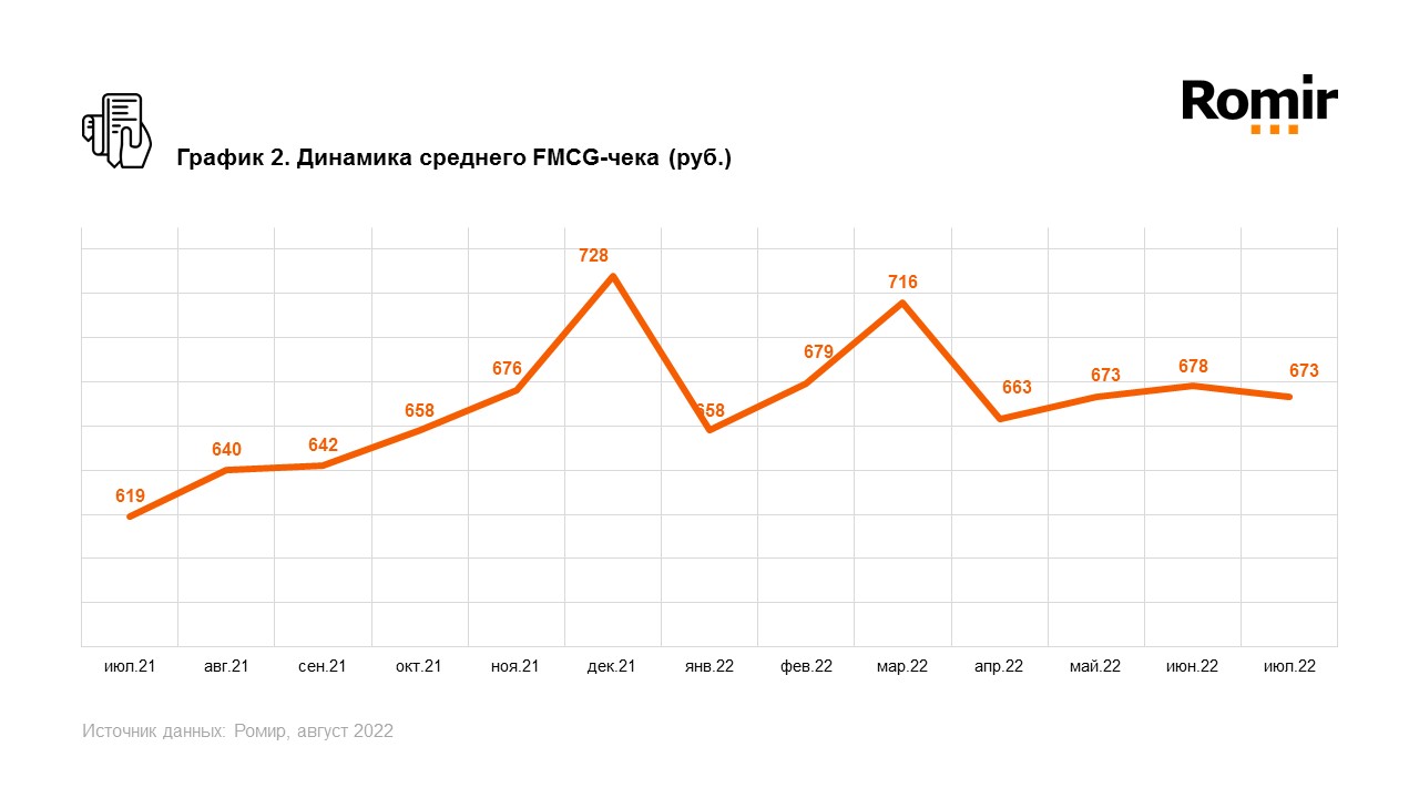 Средний чек FMCG-покупок в июле составил 673 ₽, что на 0,7 % — на 5 ₽ — меньше, чем в июне. За год показатель вырос на 8,7 %, в денежном выражении это 54 ₽.