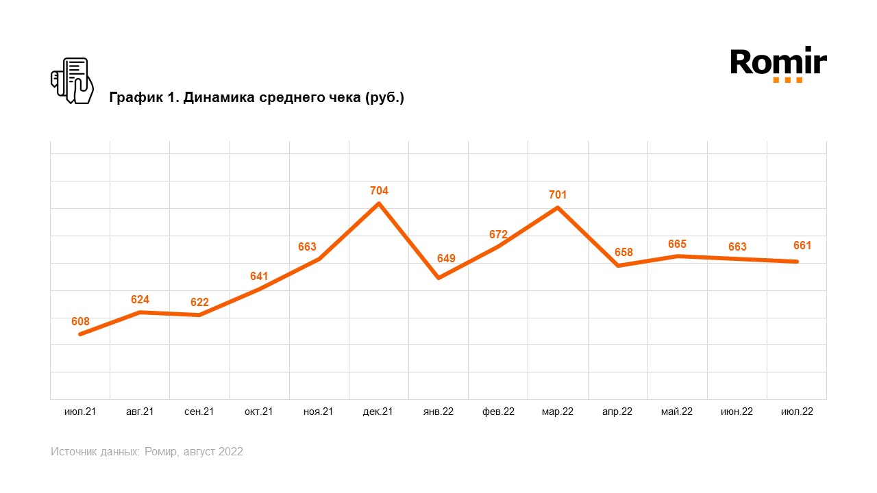 Индекс среднего чека россиянина в июле сократился на 0,3 %, то есть на 2 ₽, по сравнению с предшествующим месяцем и составил 661 ₽. В годовой динамике индекс вырос на 8,8 %, то есть 53 ₽.