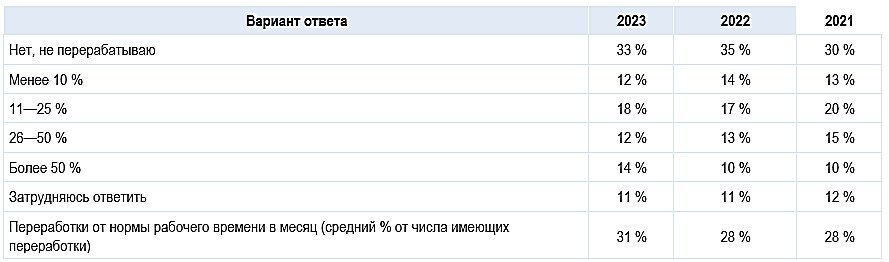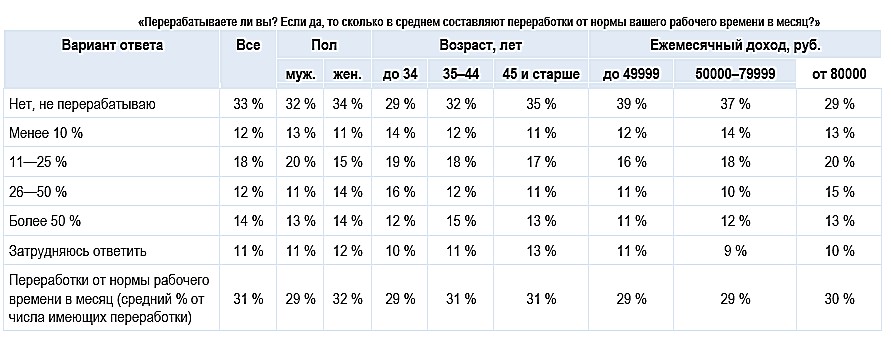 Лишь 33 % россиян не приходится работать сверх графика. Систематически перерабатывают 56 % — в среднем на 31 % от нормы рабочего времени в месяц.