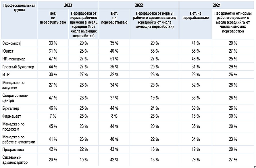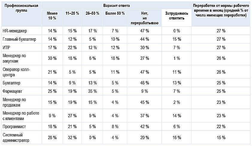 Из менеджеров по продажам перерабатывают 53 %, из операторов колл-центров — 42 %. У тех же из них, кто трудится после окончания рабочего дня, сверхурочные составляют около четверти рабочего времени.
