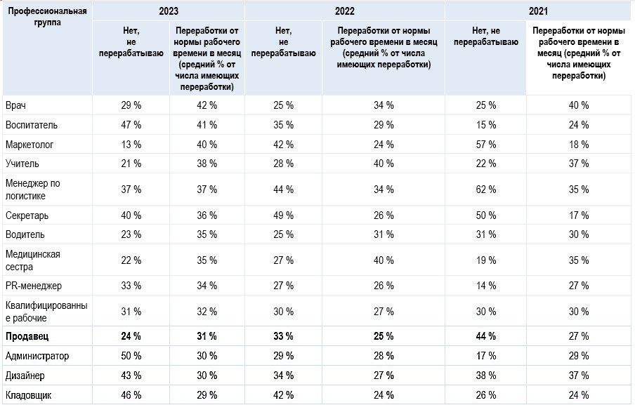 Так, в среднем 5 % продавцов ответили, что перерабатывают менее 10 % рабочего времени. При этом 24 % продавцов сказали, что не перерабатывают. В среднем переработки от нормы рабочего времени в месяц составляют 31 %. В 2023 году 24 % продавцов говорят, что не перерабатывают. В 2022 году так утверждали 33 %. В 2021 году — 44 %.