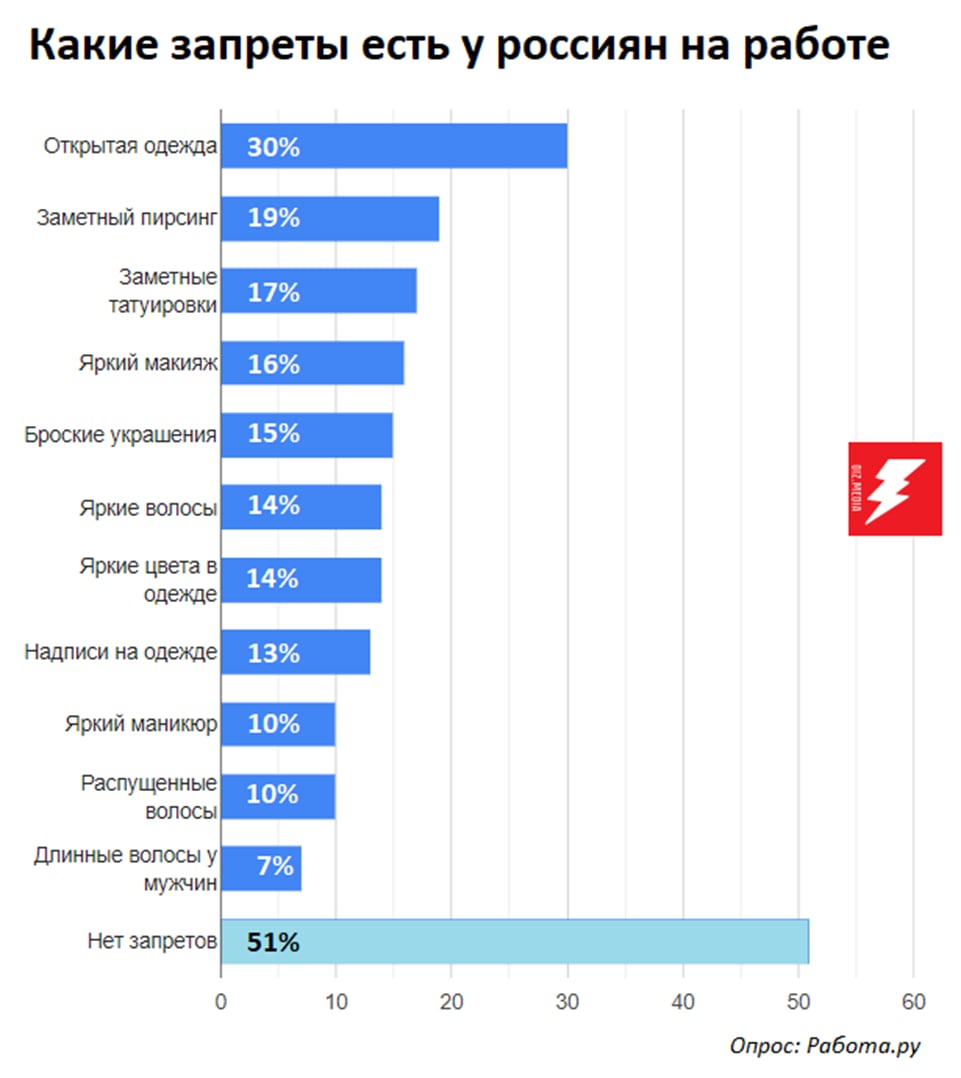 Сервис «Работа.ру» совместно с ювелирным брендом SOKOLOV провели исследование. Аналитики выяснили, какие запреты, связанные с внешним видом, чаще встречаются в российских компаниях. А также узнали, отказывали ли соискателям в найме из-за их внешности.