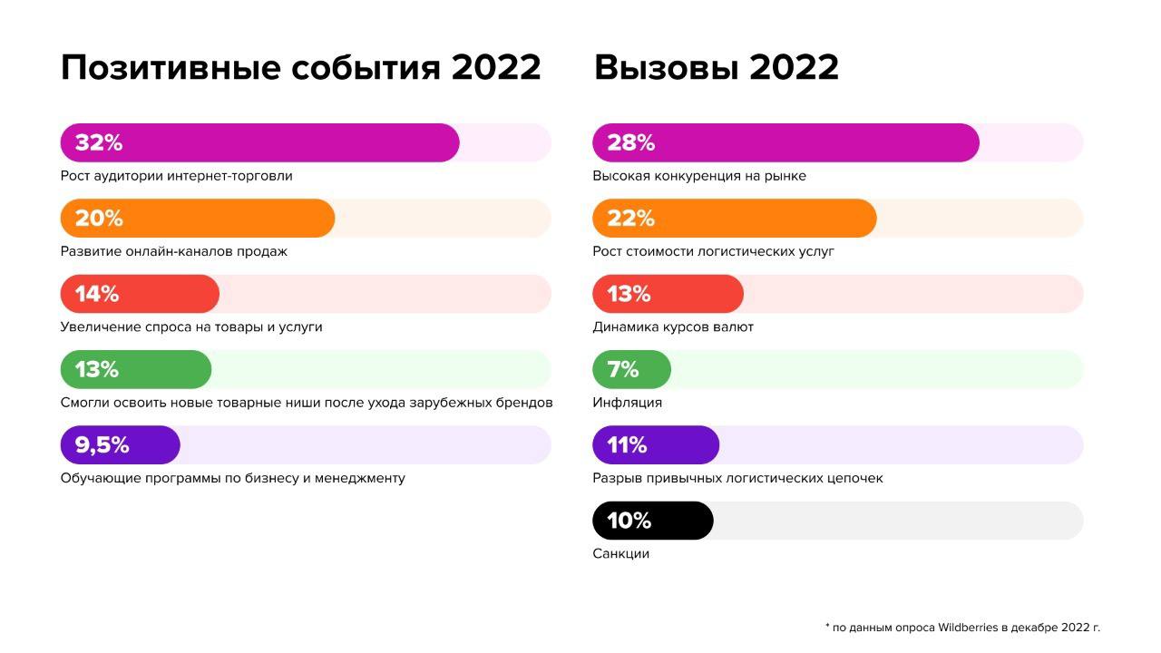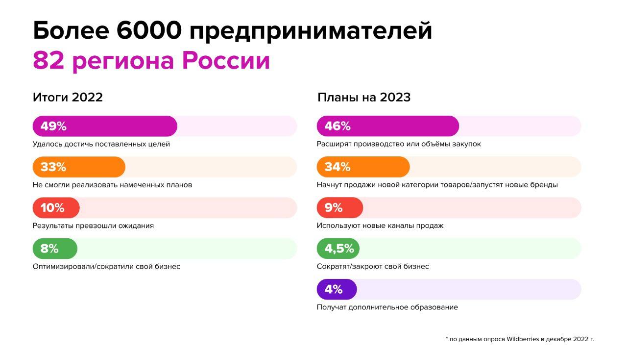 В компании Wildberries сооббщили, что опросили более 6 000 предпринимателей из 82 регионов России и узнали как они оценивают итоги 2022 года и какие планы строят на 2023 год.