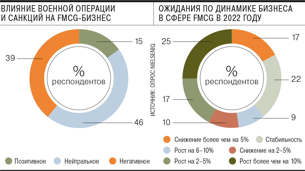 Доля ожидающих роста бизнеса среди руководителей российского ретейла и производителей товаров повседневного спроса за год сократилась с 77 % до 50 %. Таковы результаты опроса NielsenIQ, проведённого среди топ-менеджеров российских FMCG-компаний. Их них 39 % отметили негативное влияние на бизнес событий после 24 февраля.
