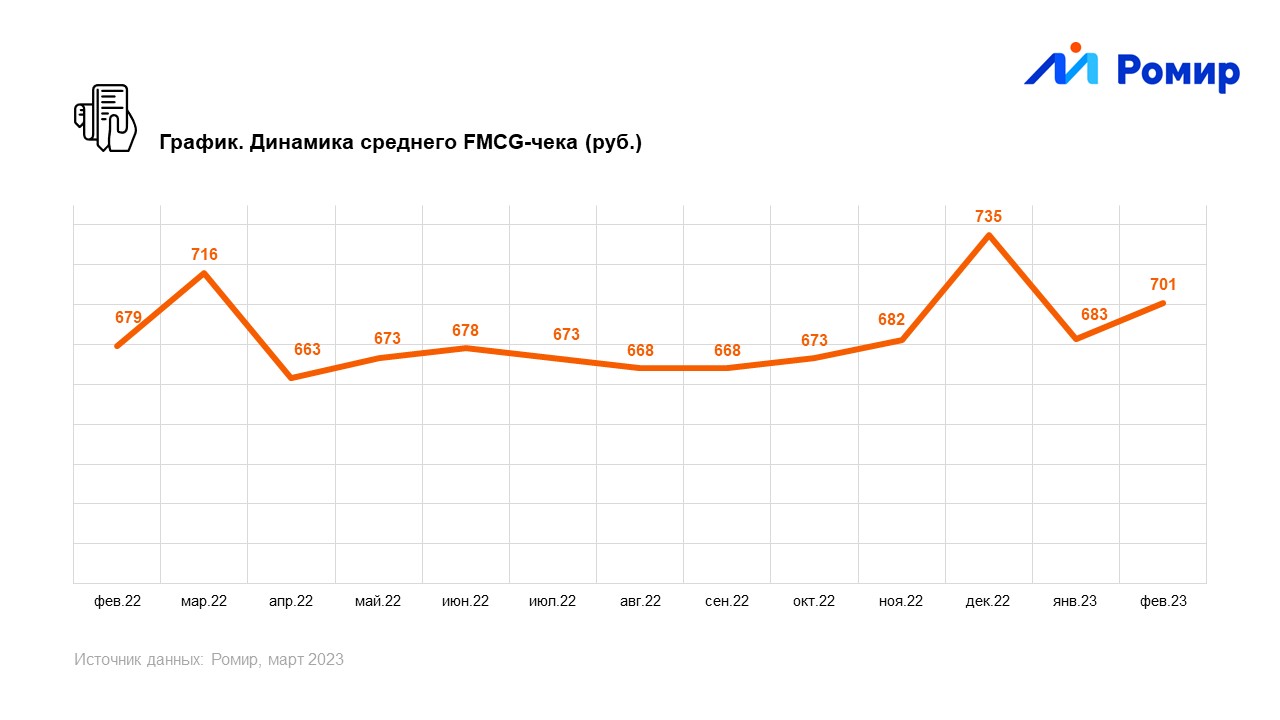 Значение FMCG-чека россиянина в феврале выросло на 2,6 % — 18 ₽ — по сравнению с январём, подсчитали аналитики «Ромир». Средняя стоимость одной покупки товаров повседневного спроса составила 701 ₽. В годовой динамике это +3,3 %, или 22 ₽ в денежном выражении.