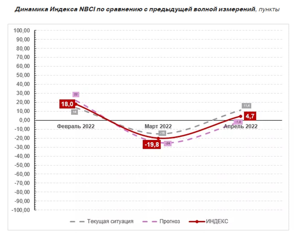 Значение Индекса NBCI выросло с «–19,8» в марте до «4,7» пунктов в начале мая. Индекс делового климата NBCI (NAFI Business Climate Index) основывается на данных опроса 500 малых и средних предпринимателей. Индекс рассчитывают как среднее геометрическое значение по балансовым оценкам текущей ситуации и будущих ожиданий