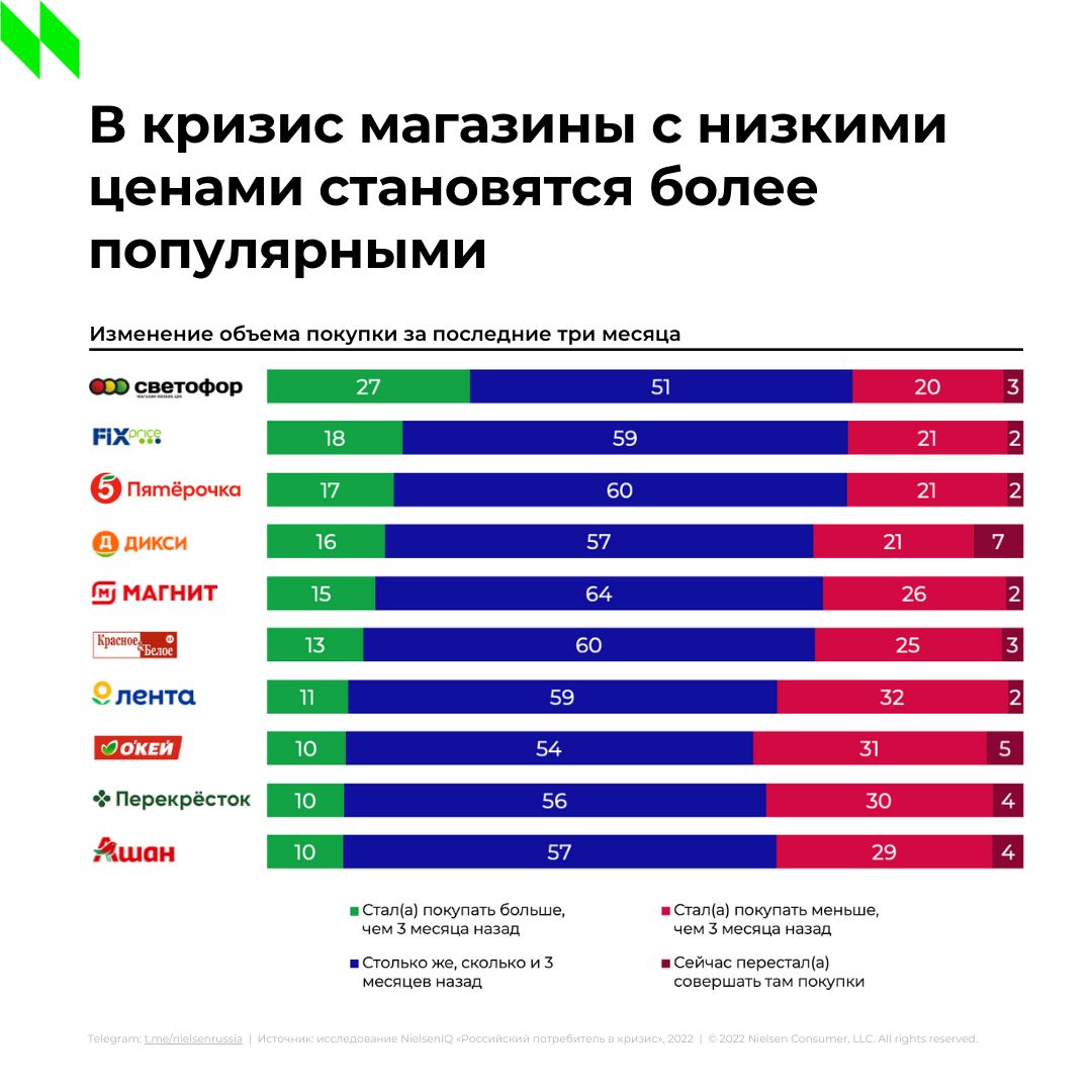 Что касается населения, то его покупательское поведение говорит о снижении уровня потребления. По данным NielsenIQ, 73 % покупателей в России стараются сократить расходы по сравнению с прошлым годом. А 61 % покупателей называют выбор магазинов с более низкими ценами основной стратегией экономии.