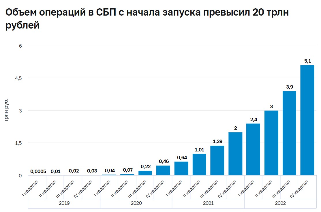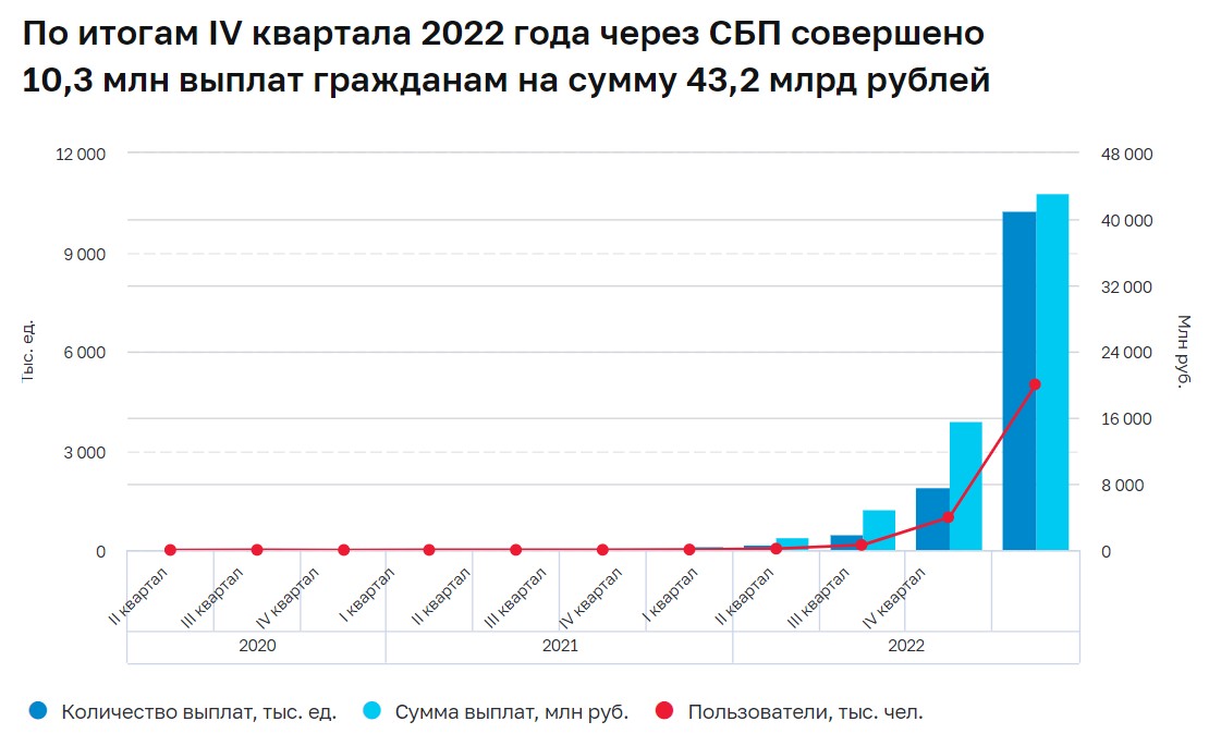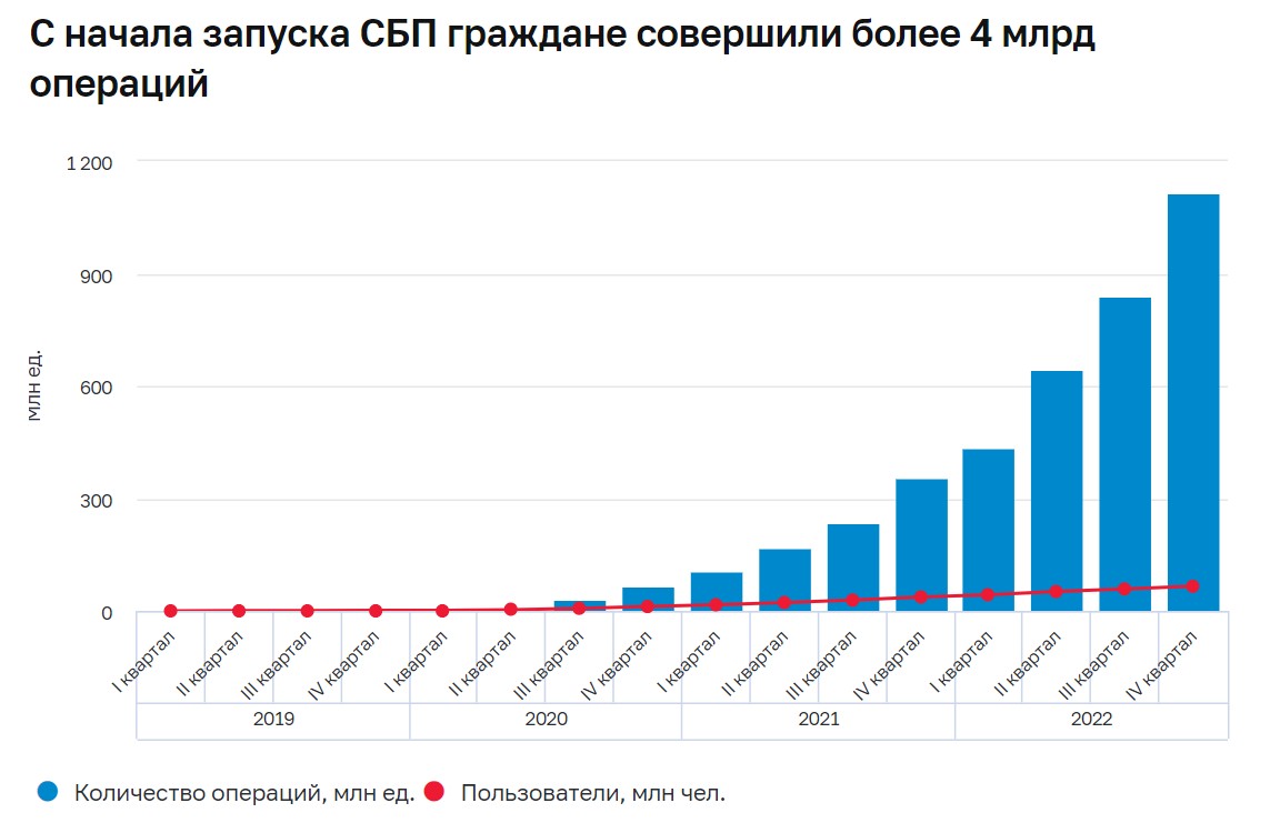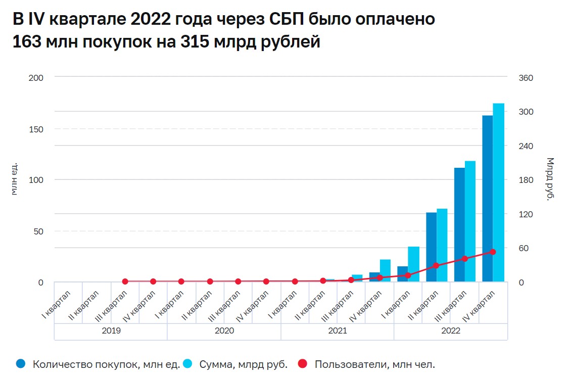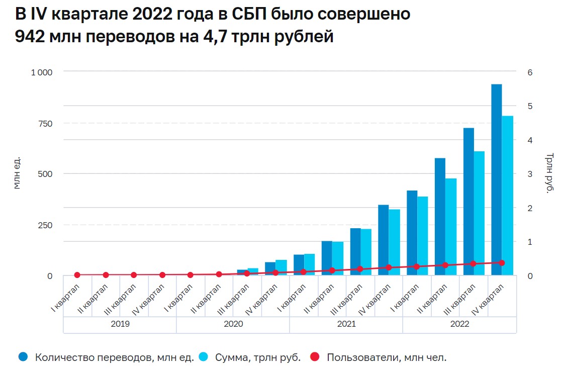 В IV квартале 2022 года граждане провели через СБП более 1,1 млрд операций на сумму 5,1 трлн ₽. При этом за весь 2022 год в СБП совершено более 3 млрд операций на 14,4 трлн ₽, что превышает аналогичные показатели за 2019 — 2021 годы в 3,1 и 2,4 раза соответственно. К системе подключено 213 банков.