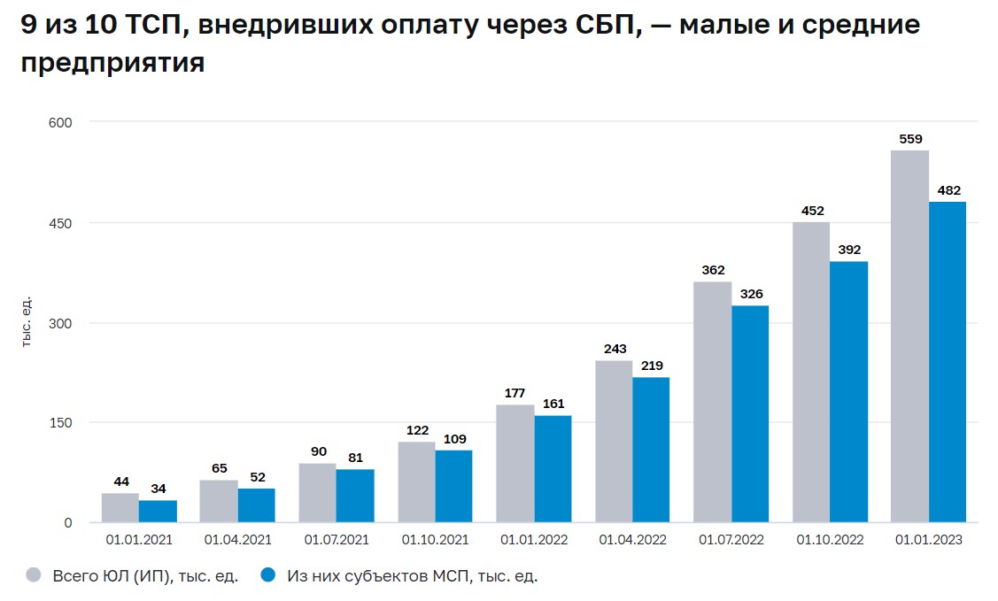 Количество предприятий торговли и сервиса (ТСП), принимающих оплату через СБП, по сравнению с предыдущим кварталом увеличилось на 24 %, до 559 тысяч.
