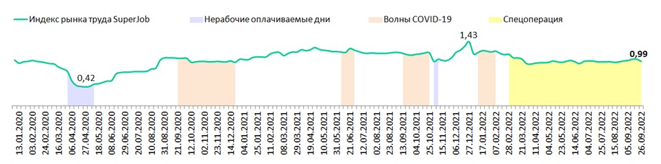 Индекс рынка труда составляет 0,99 пункта, что практически соответствует средней рекрутинговой активности компаний в аналогичные периоды 2017–2019 годов. За неделю произошло небольшое снижение показателя — минус 0,05 пункта.