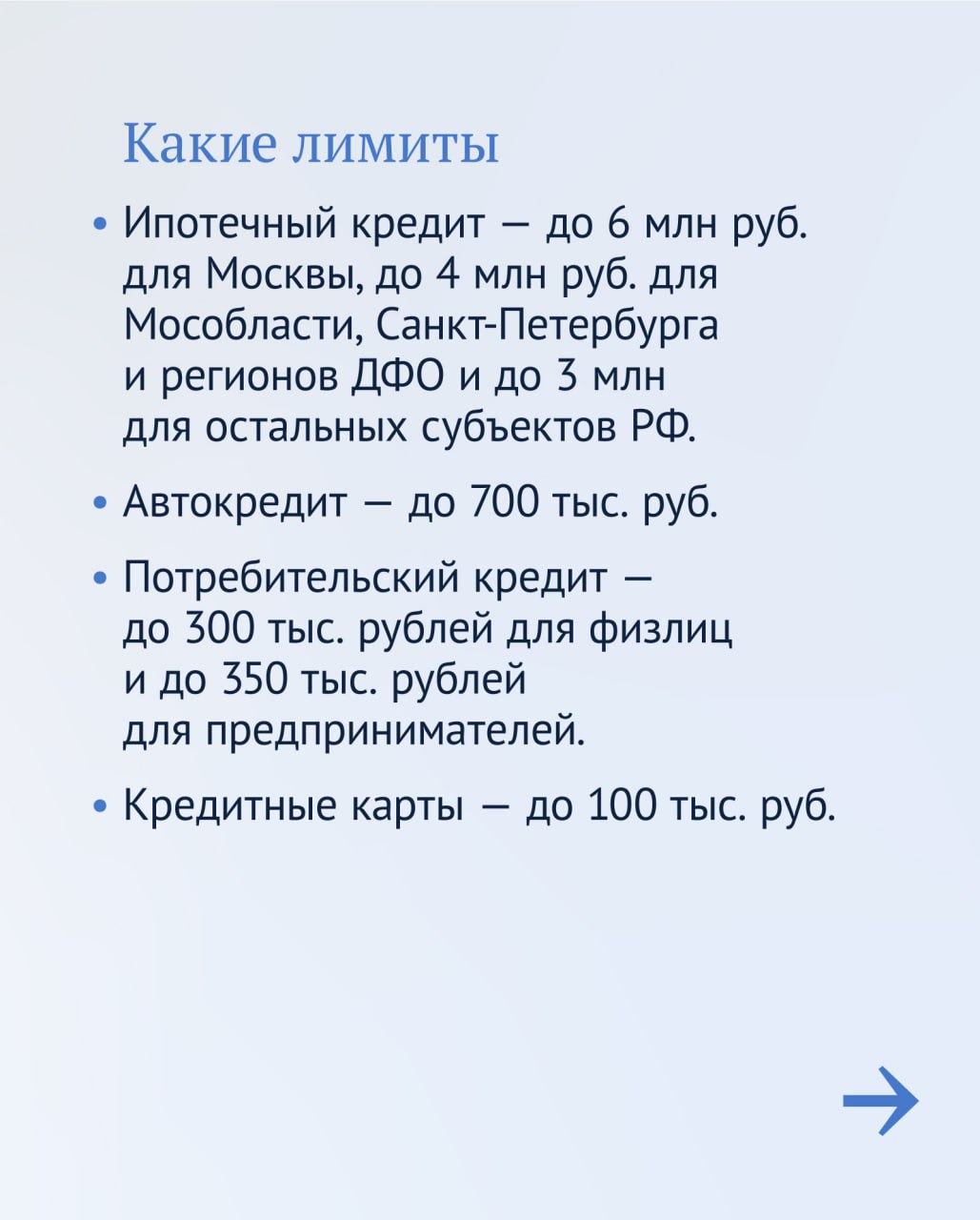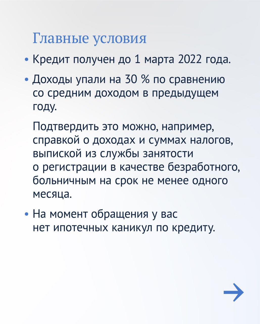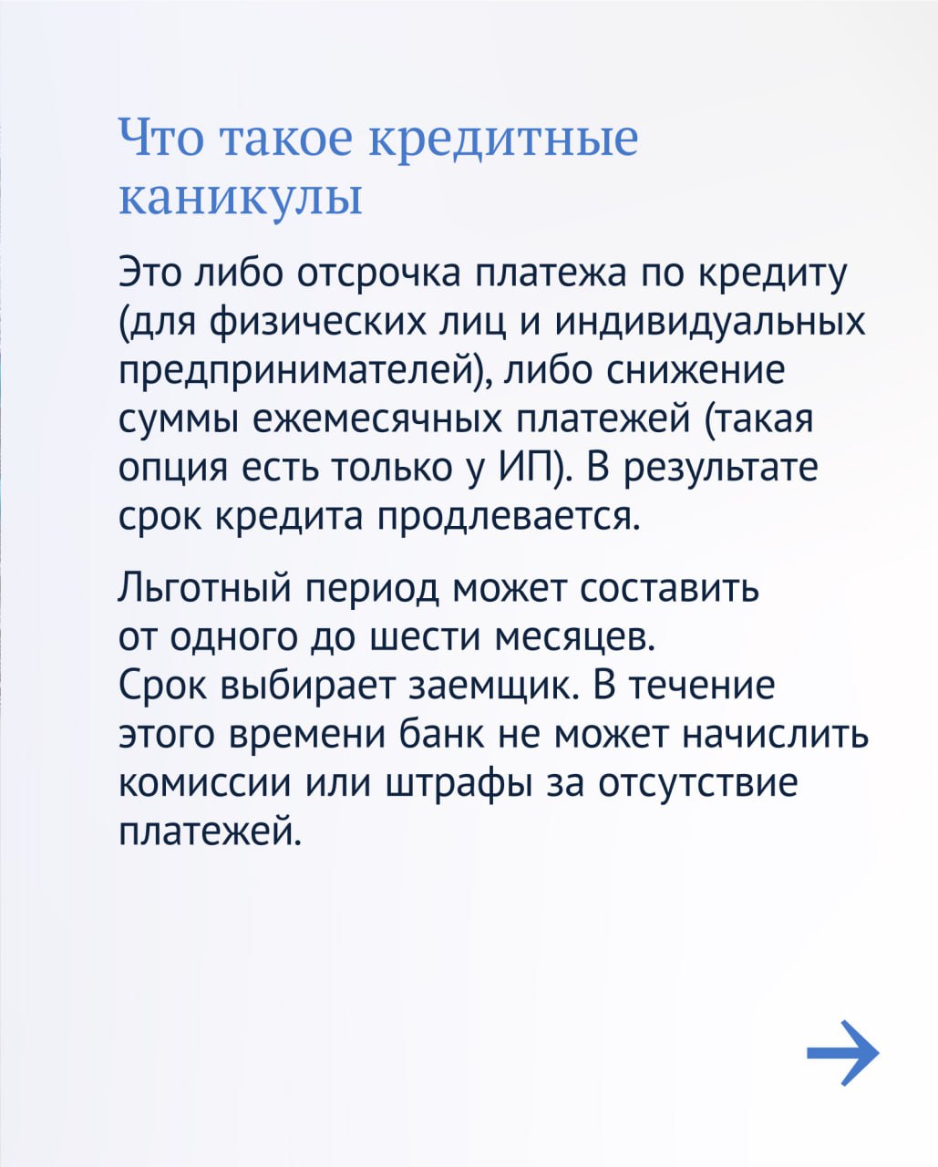 Чтобы россияне успели воспользоваться кредитными каникулами, официальный телеграм-канал Государственной Думы подготовил наглядные карточки.