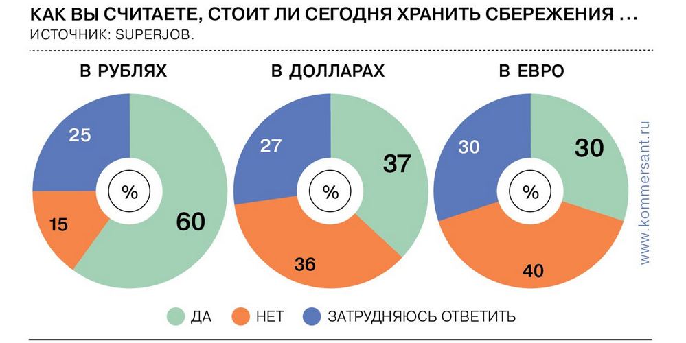 В том, что следует перевести накопления в американскую валюту, уверены 37 % опрошенных, в европейскую — 30 %. Мнение об устойчивости рубля чаще всего разделяют представители старшего поколения — 62 %. Уверенность в надёжности доллара и евро больше свойственна опрошенным моложе 34 лет — 44 % и 39 % соответственно.