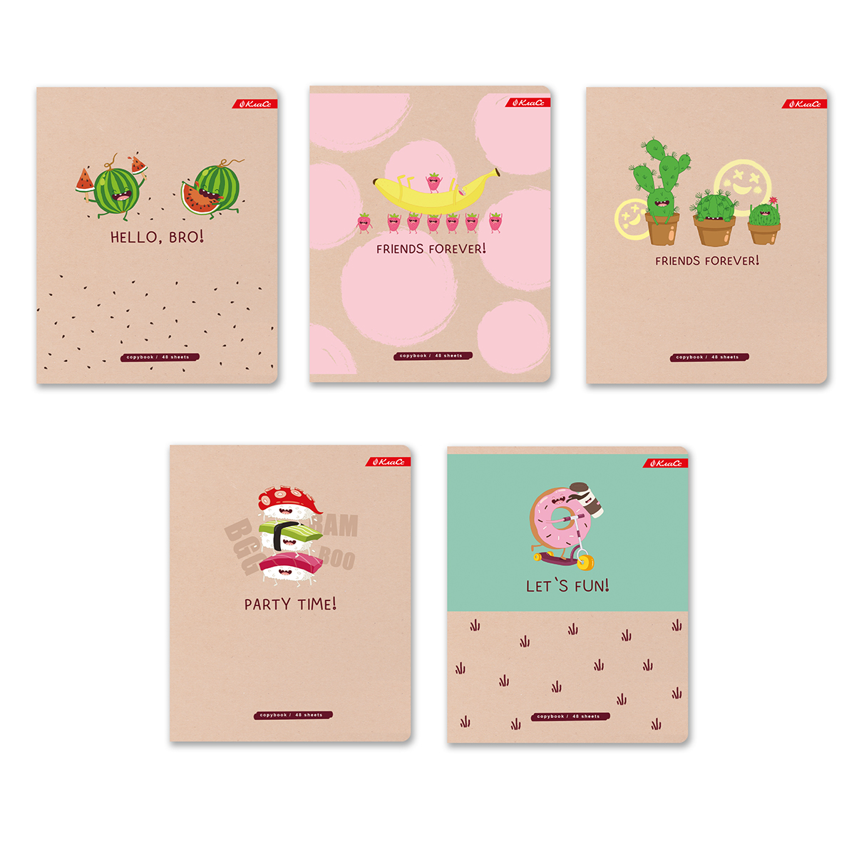 Тему дружбы в оформлении тетрадей интересно переосмысливает молодой бренд SVETOCH. Все плюсы таких тёплый отношений на обложках демонстируют арбузы, бананы, клубника и даже кактусы, суши и пончики. Пожалуй, самый необычный вариант.