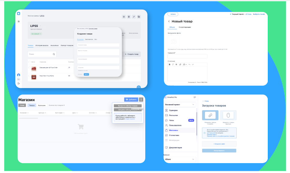 В зависимости от конструктора можно заполнить каталог товаров в Telegram-магазине вручную или путём массовой загрузки. Если у вас большой ассортимент, можно загрузить товары через Excel-файл или фид. На некоторых платформах доступны готовые шаблоны и подробная инструкция для обоих методов загрузки.