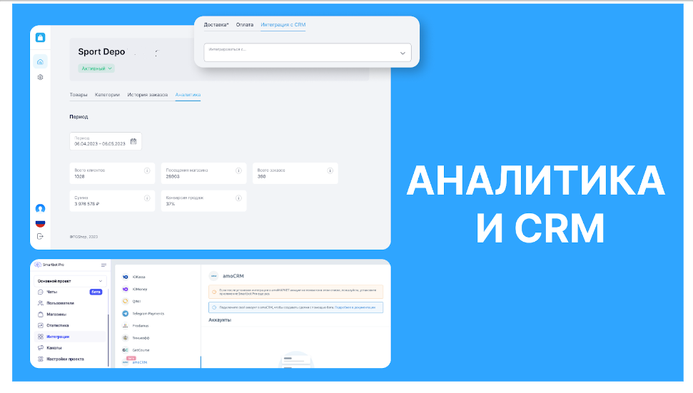 Подключение CRM поможет отслеживать все заказы из различных источников в одном месте, а следовательно, анализировать различные метрики вашего Telegram-магазина, такие как конверсия продаж, количество посещений магазина, совершенные покупки и даже неоплаченные заказы. Вы сможете наблюдать каждый шаг покупателей воронки от первого контакта до конверсии. Но такая функция доступна не во всех конструкторах.