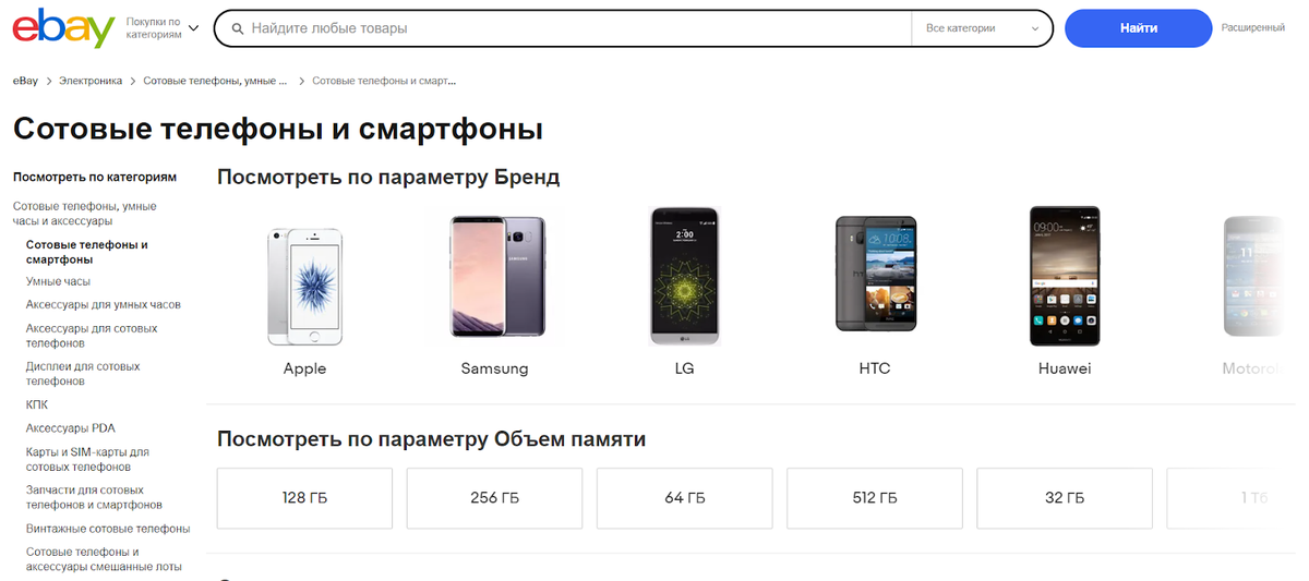 1. Ebay: пользователь зашёл в раздел «Электроника», затем — в «Сотовые телефоны и смартфоны» — и видит малоинформативную подборку устройств, половина из которых ещё и безнадёжно устарела. В центре экрана — выбор вариантов по объёму памяти, выстроенных в не самом логичном порядке. Слева набор категорий, в том числе умные часы и запчасти, хотя читатель уже находится в категории смартфонов, где должны быть iPhone, Samsung Galaxy и другие популярные модели.