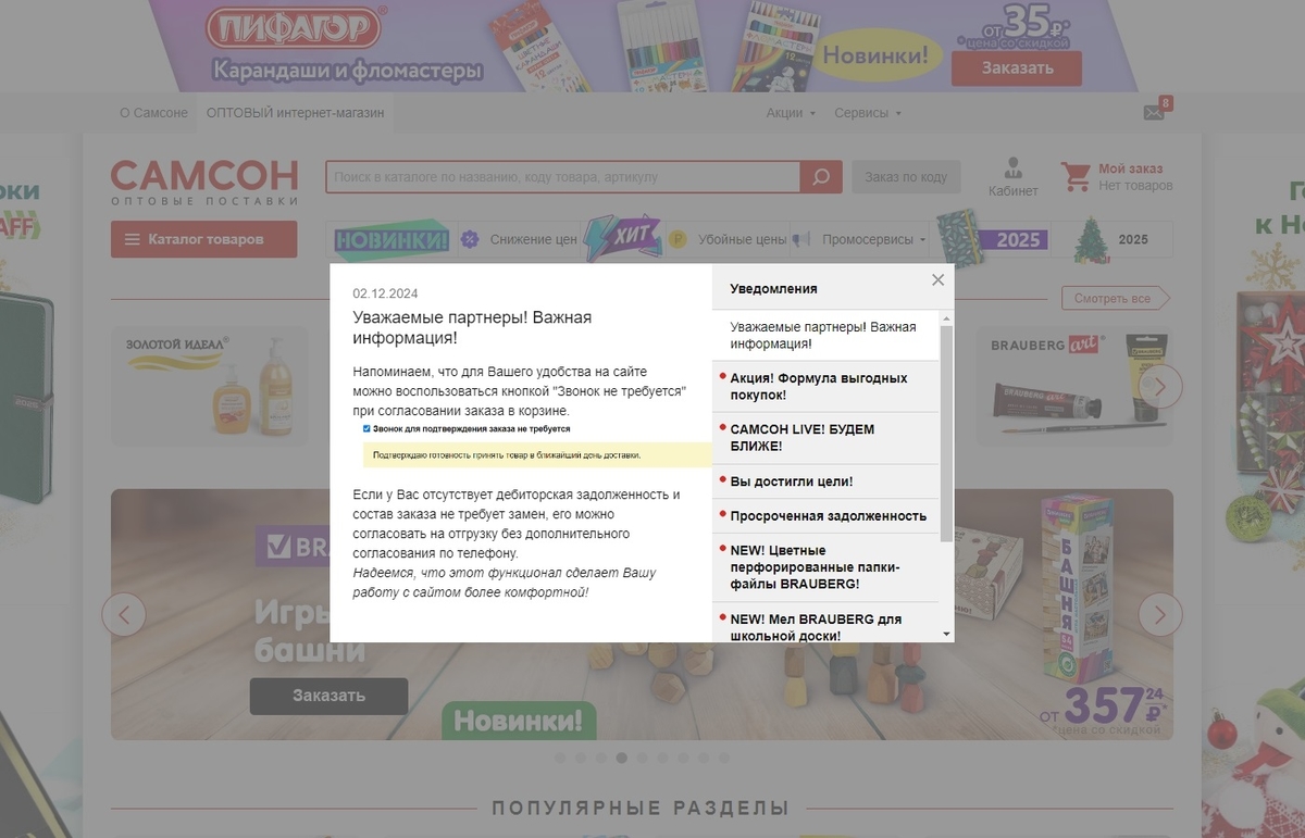 Вот пример не самого удачного использования call-to-action [призыва к действию — прим. ред.]. На сайте «Самсона», как только авторизовался, на тебя нападает всплывающее окно с кучей новостей.